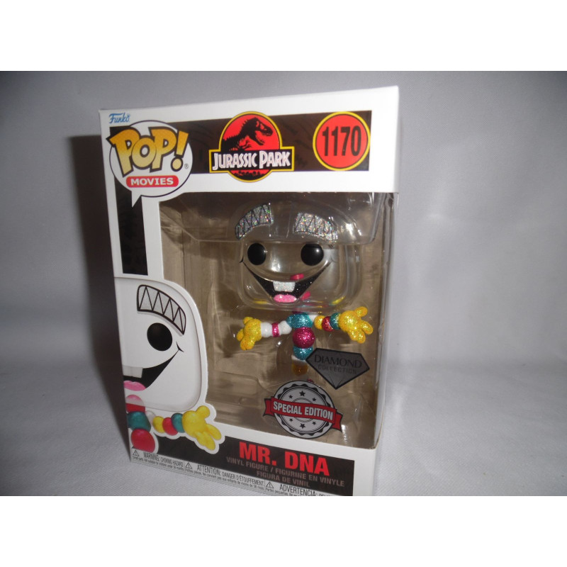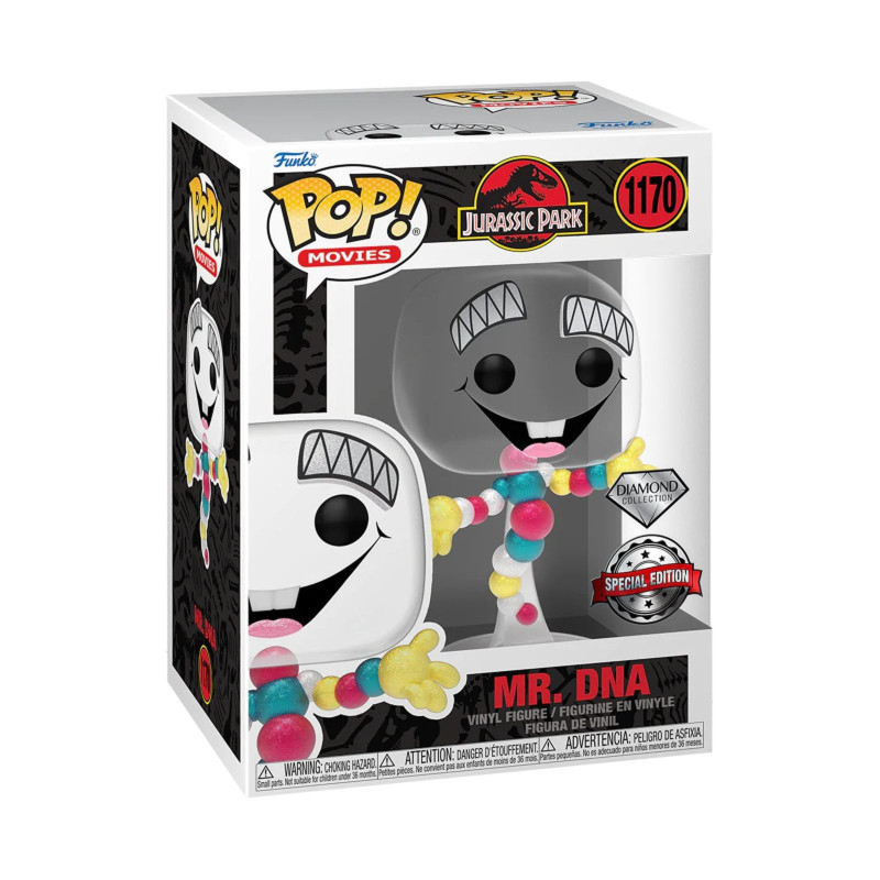 Inspiré par la présentation de la procédure de fabrication des dinosaures, dans le film Jurassic Park, cette figurine de Monsieur ADN a été revisité par Funko pour sa collection Diamond. Cette POP numéro 1170 de la gamme Movies est couverte de paillettes, ce qu'il la rend brillante.