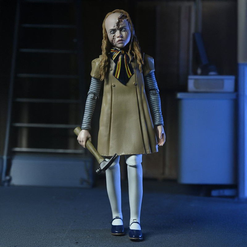 À l’échelle 7 pouces (environ 18 cm), cette figurine articulée reproduit fidèlement chaque détail du design de M3GAN : sa robe beige emblématique, son nœud bleu, ses longs cheveux lisses et son expression glaciale. Les finitions sont d’un réalisme bluffant, traduisant à merveille le mélange inquiétant d’humanité et de machine qui définit le personnage.