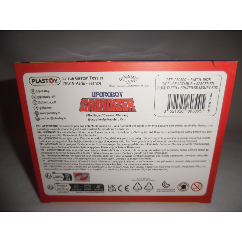 Conçue par Plastoy, fabricant renommé pour ses produits sous licence officielle, cette tirelire est un article authentique, respectant l’univers et l’esthétique de Goldorak. Elle s’intègre parfaitement dans une collection d’objets dérivés ou sur une étagère aux côtés d’autres figurines et accessoires Goldorak.